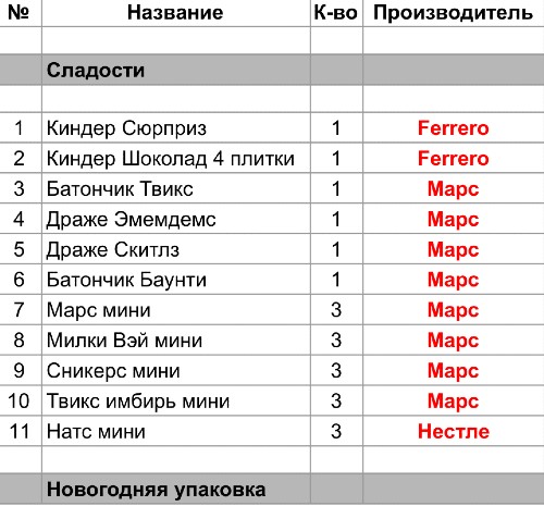 Батончик Твикс (1 шт), Драже Эмемдемс (1 шт), Драже Скитлз (1 шт), Батончик Баунти (1 шт), Марс мини (3 шт), Милки Вэй мини (3 шт), Сникерс мини (3 шт), Твикс имбирь мини (3 шт)